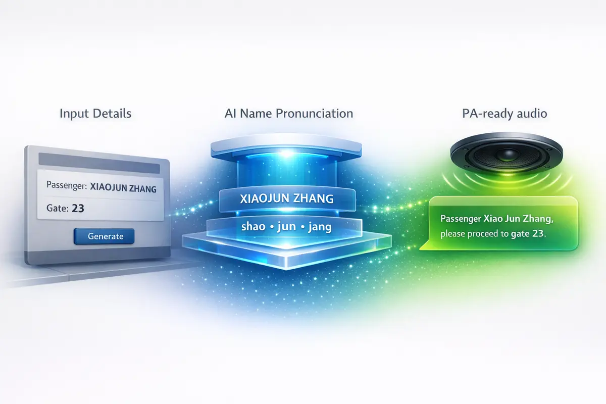 International names and spelling variations make manual calls inconsistent in airports and other busy public venues. Our purpose-built name pronunciation model and TTS pipeline generates consistent and natural sounding announcements.